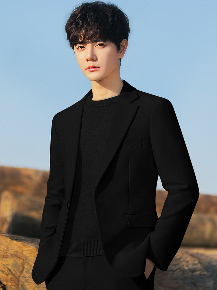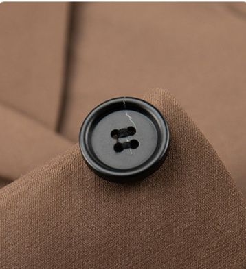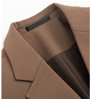 一つボタンのテーラードジャケットはすっきりとした印象を与え、細身のシルエットが現代的なスタイルを演出します。