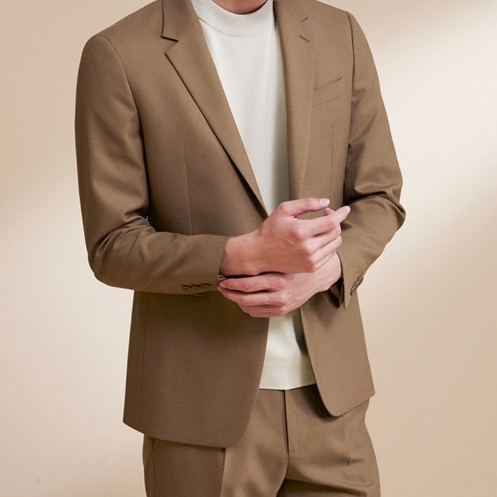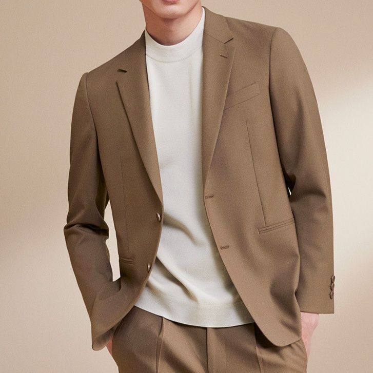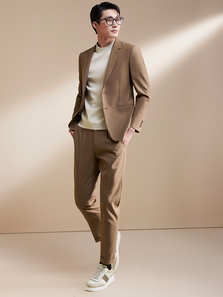 程よくゆとりのあるジャケットとテーパードパンツの組み合わせで、ビジネスシーンからカジュアルな場面まで幅広く活躍します。