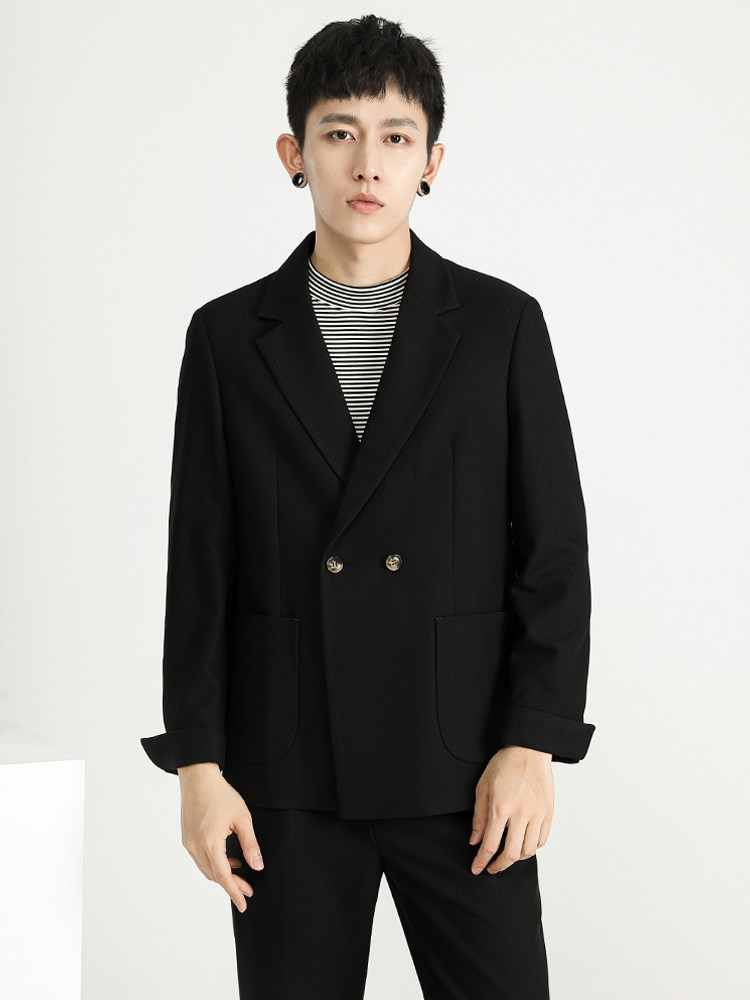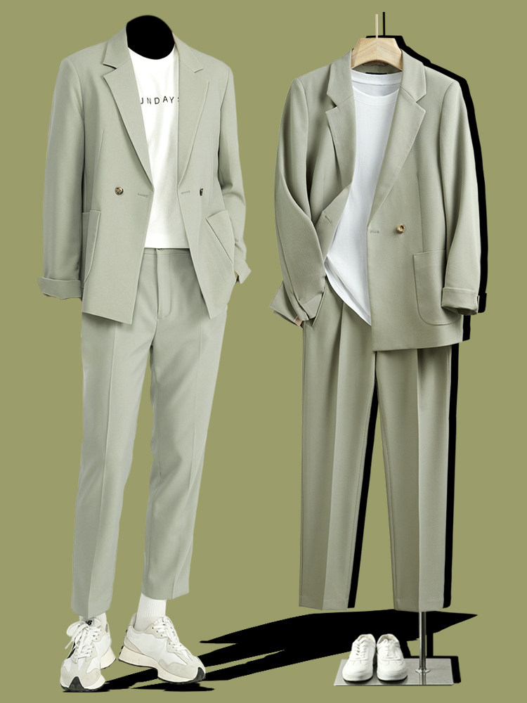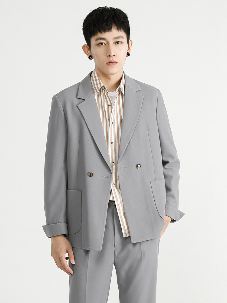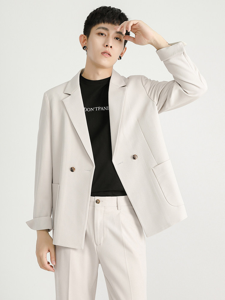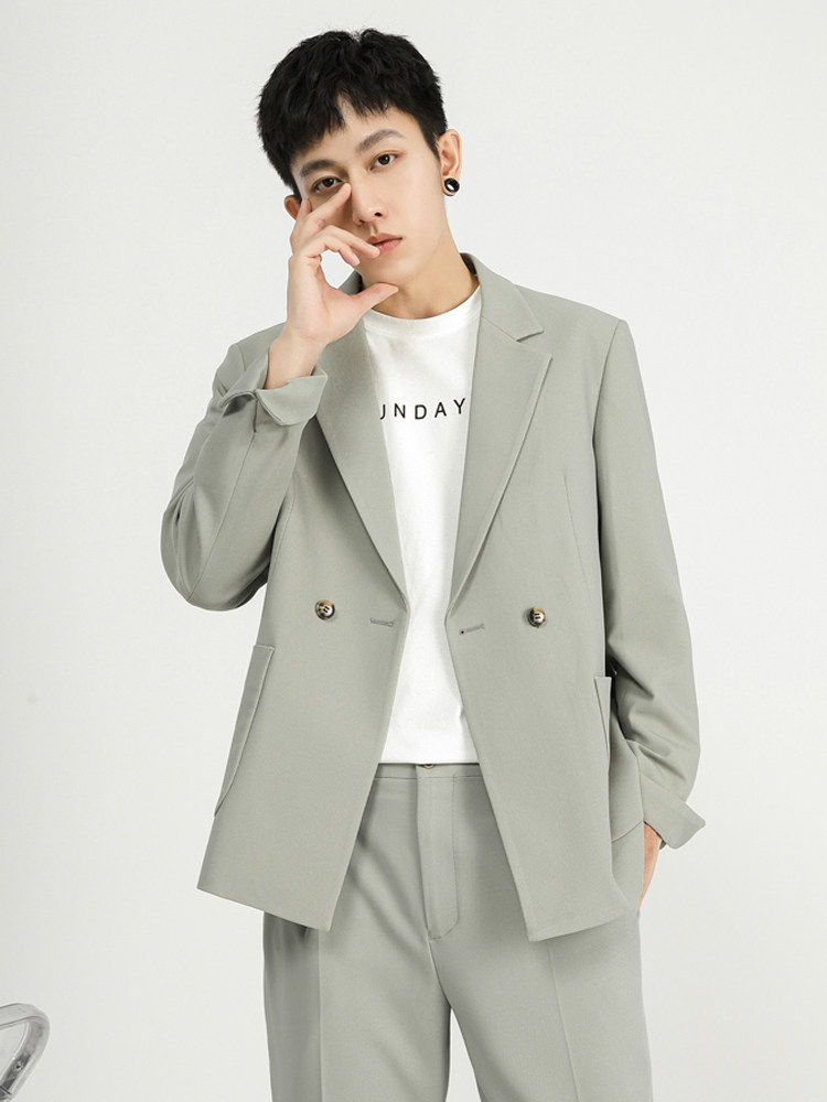 洗練されたダブルブレストデザインが特徴のメンズカジュアルスーツです。